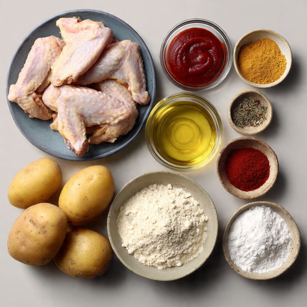 In a bowl, toss the wings with olive oil, paprika, garlic powder, salt, and pepper. In another bowl, soak the potato strips in water for 30 minutes, then pat them dry and toss with cornstarch, olive oil, salt, and pepper. - Prepare Your Cooking Vessel: