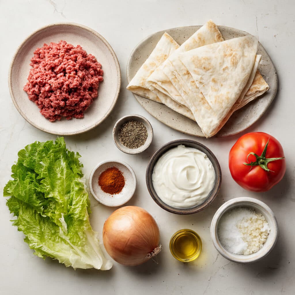 Soft lavash wraps filled with seasoned beef, fresh vegetables, and creamy yogurt sauce, perfect for a quick and satisfying meal.