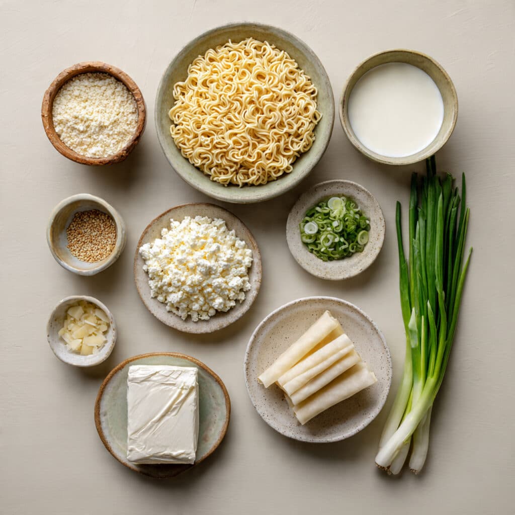 - Combine Ingredients: Boil the ramen noodles according to package instructions, drain them, then mix with the seasoning packets, heavy cream, cream cheese, garlic powder, and mozzarella until creamy and well coated. Stir in green onions.