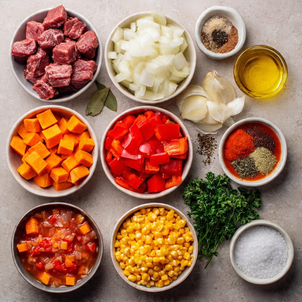 Add olive oil and sear the beef cubes until browned on all sides. Remove and set aside. In the same pot, sauté onions, garlic, and bell peppers until softened and fragrant. - Prepare Your Cooking Vessel: