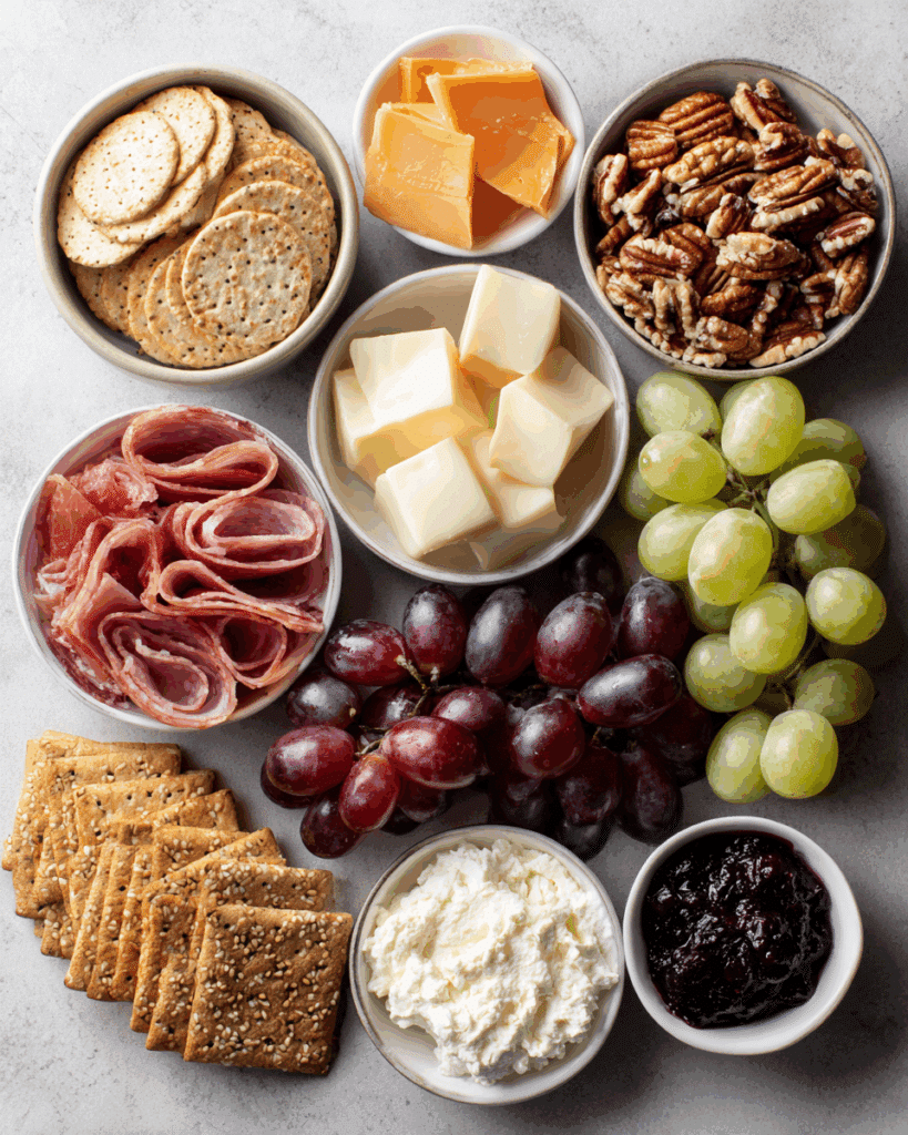 - Crackers or breadsticks: 3-4 pieces – These provide a crunchy contrast to the soft cheeses and meats.