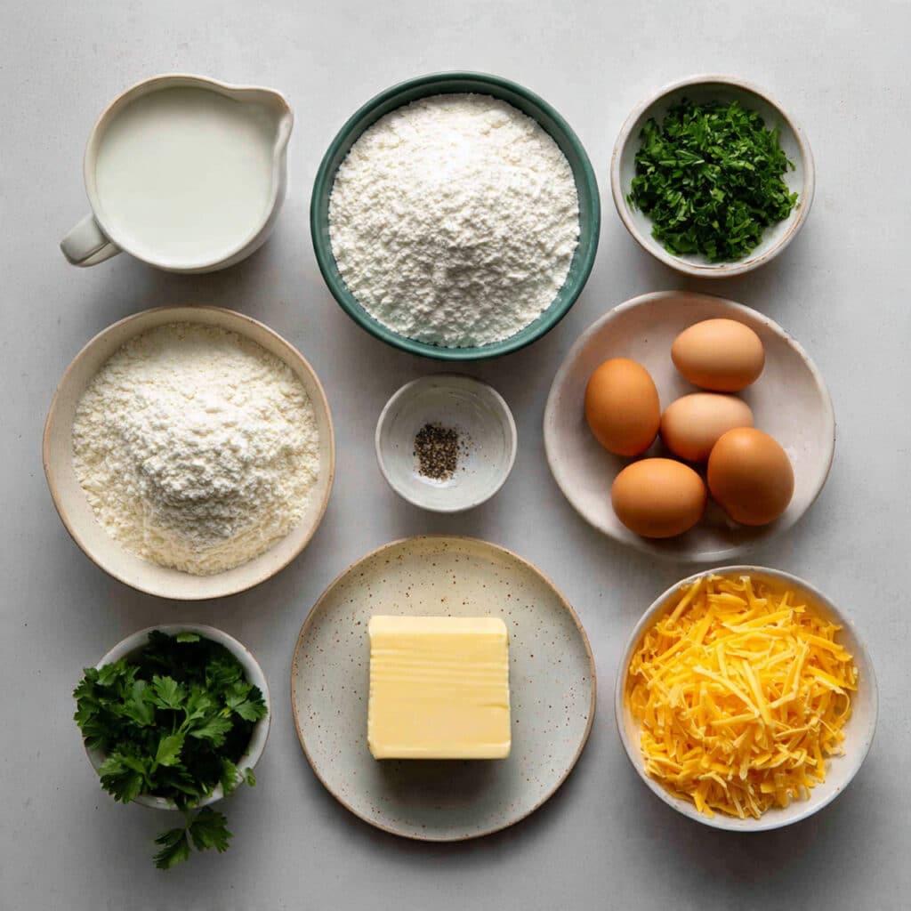 - Cheddar Cheese: 1 cup shredded, melts into the batter creating cheesy pockets.