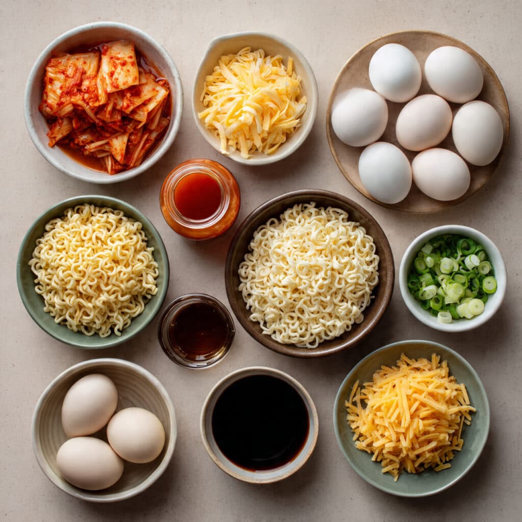What makes each bite exciting is the contrast. The noodles are chewy, the cheese is creamy and stretchy, and the kimchi adds a punch of tangy crunch. The egg brings everything together with its rich, silky texture.
