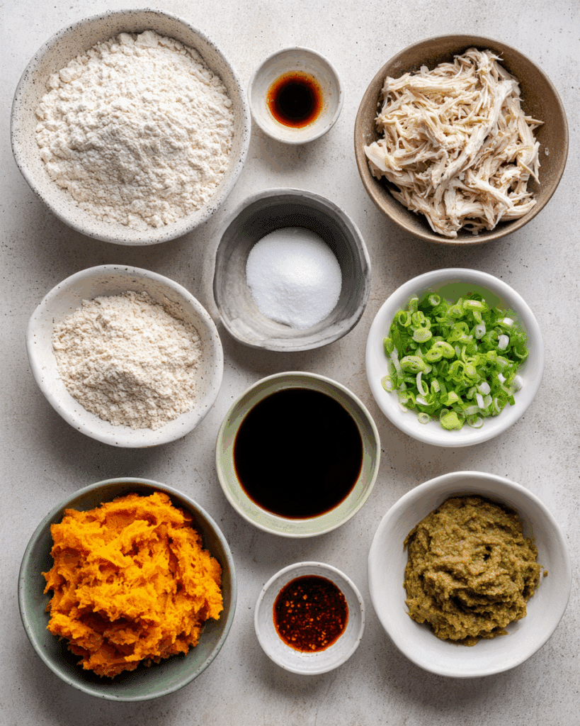 - Cooked Chicken (shredded): 1 ½ cups – Adds a juicy, protein-packed center.
