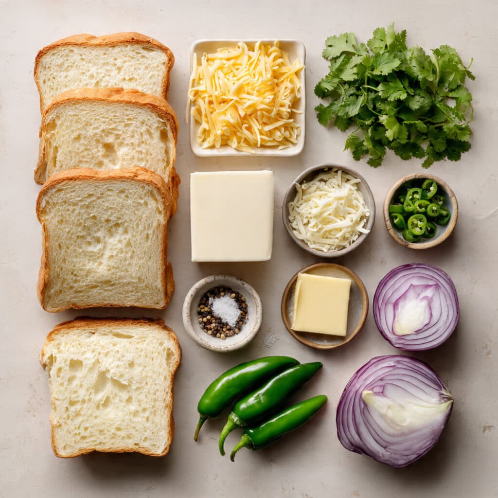 - Bread Slices: 4 thick white or brown bread slices – A sturdy base that holds the cheesy topping without getting soggy.