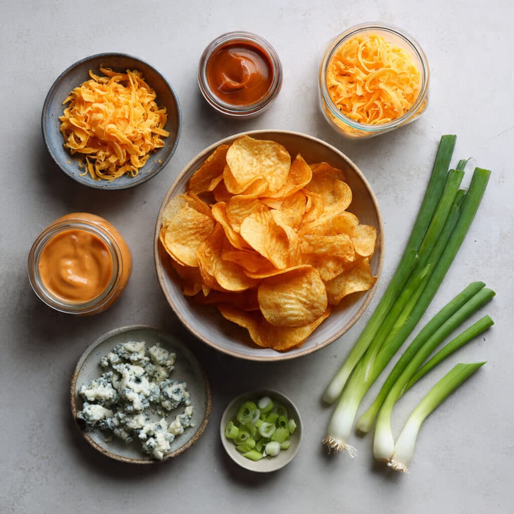 Crispy kettle chips loaded with cheddar, blue cheese, and a drizzle of buffalo sauce, baked until gooey and golden for the ultimate snack tray.