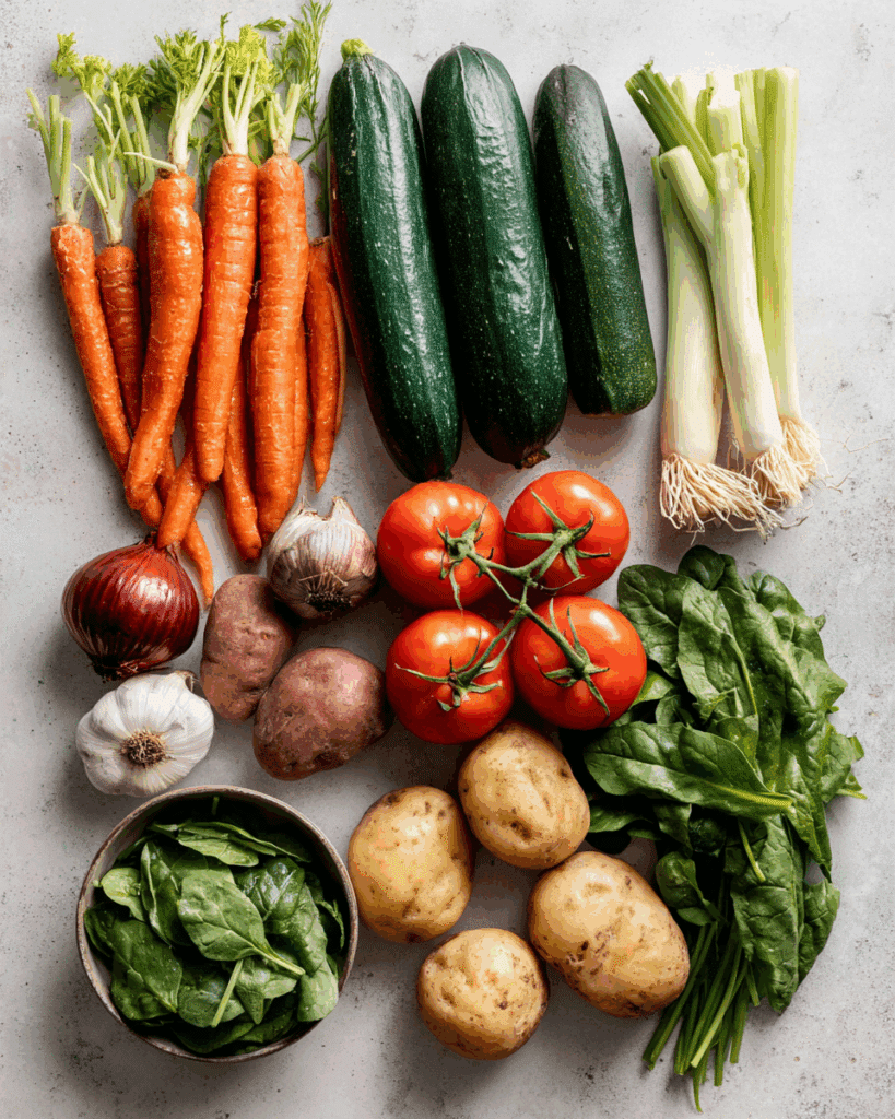 This soup offers a beautiful contrast of textures – from the tender vegetables to the hearty potatoes and fresh spinach. The flavors develop slowly as the ingredients simmer together, with each vegetable contributing its unique essence to the broth. The broth itself is rich, savory, and lightly seasoned, allowing the natural flavors of the vegetables to shine.
