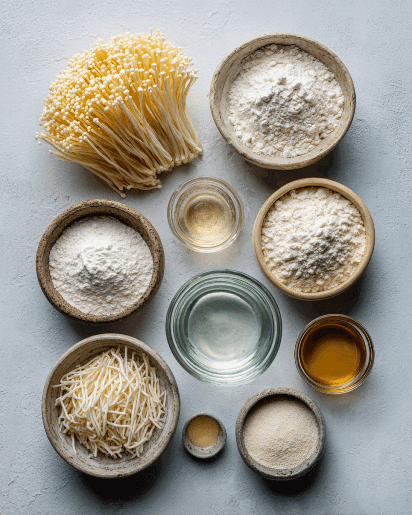 - Assemble the Dish: Coat small bundles of enoki mushrooms in the batter.