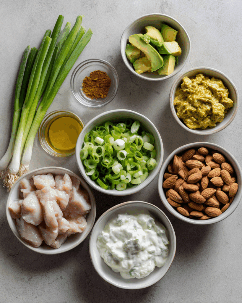 - Assemble the Dish: To the chicken mixture, add the chopped green onions, diced avocado, and toasted almonds. Mix gently to combine, being careful not to mash the avocado.