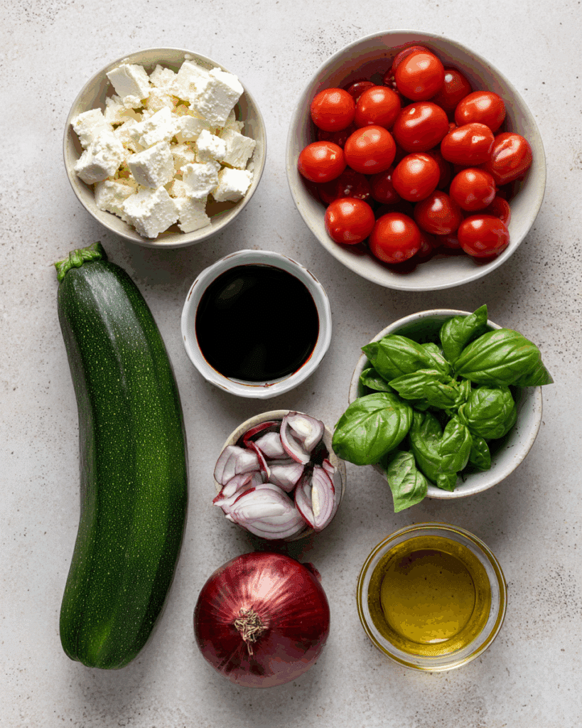 - Assemble the Dish: In a large bowl, combine the grilled courgettes, halved cherry tomatoes, thinly sliced red onions, and crumbled feta.