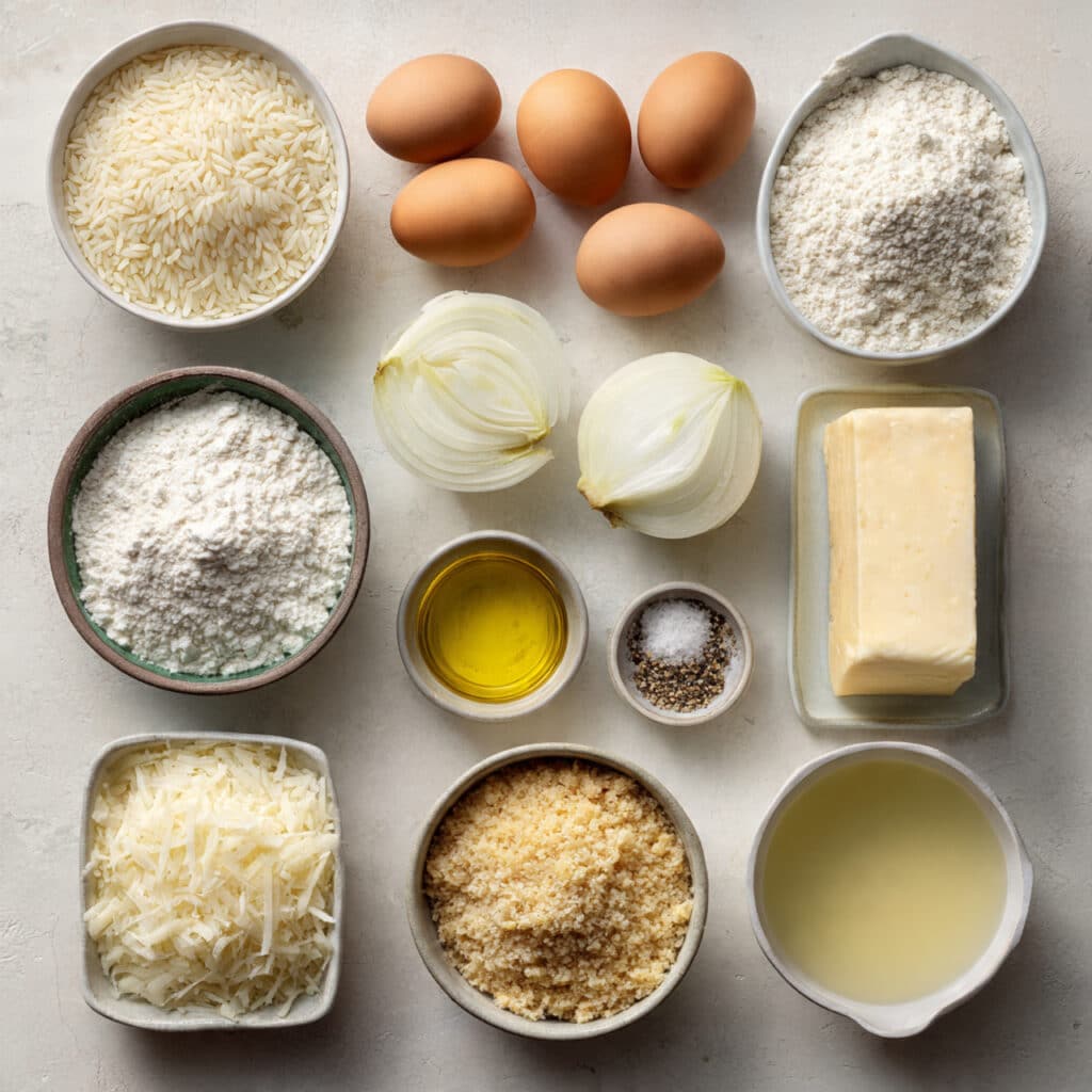 - Arborio Rice: 1 ½ cups. This short-grain rice releases starch, creating a creamy risotto base perfect for forming.