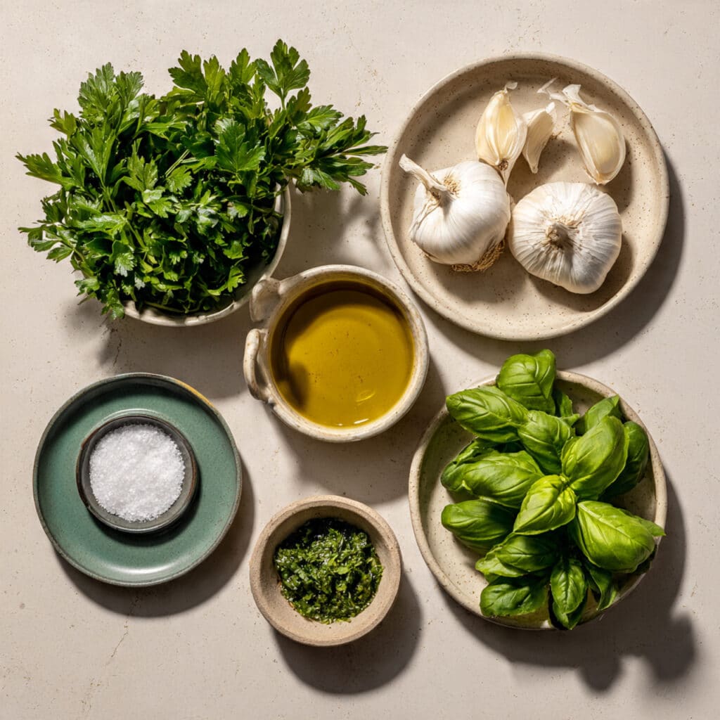 - Combine Ingredients: In a mixing bowl, stir together chopped parsley, basil, minced garlic, salt, and olive oil until evenly blended.