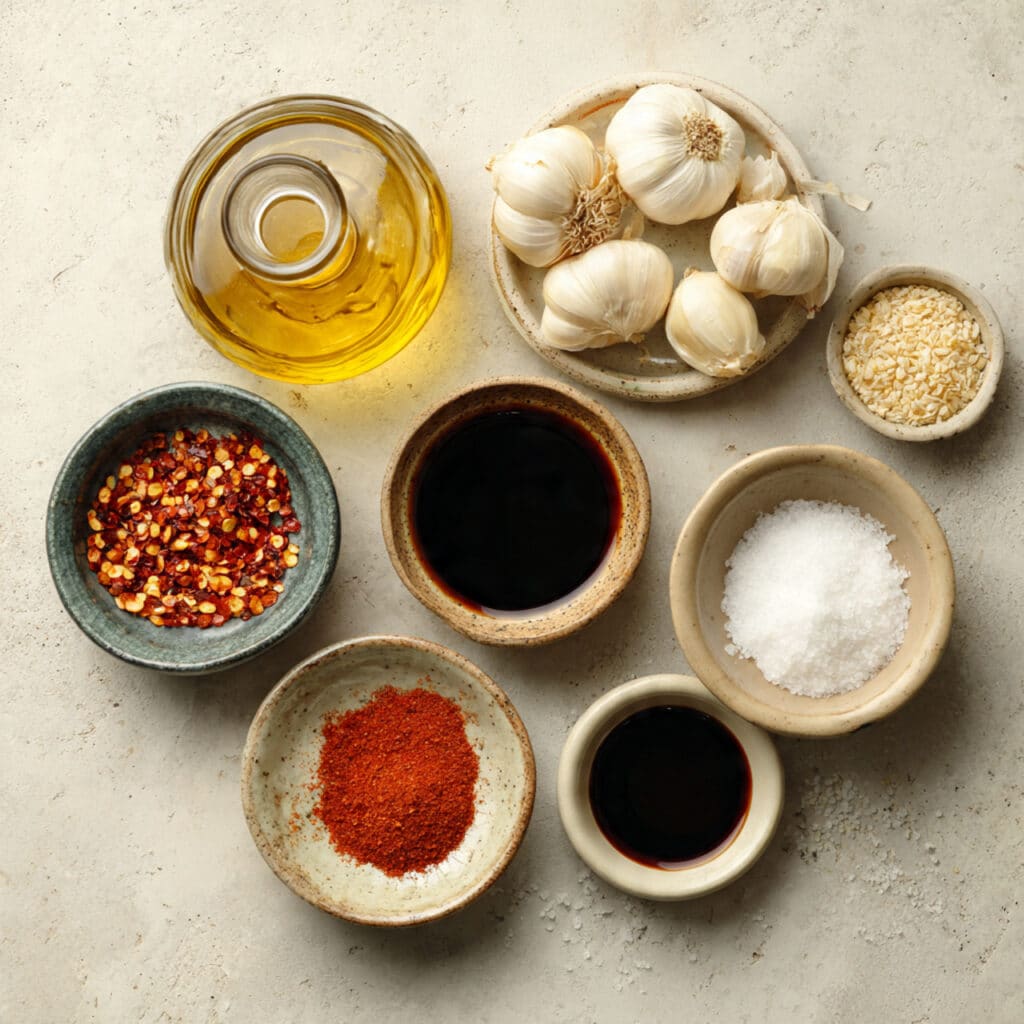 A bold and aromatic homemade chili oil made with crushed red pepper flakes, garlic, and warm spices. Perfect for drizzling over noodles, eggs, vegetables, and more.