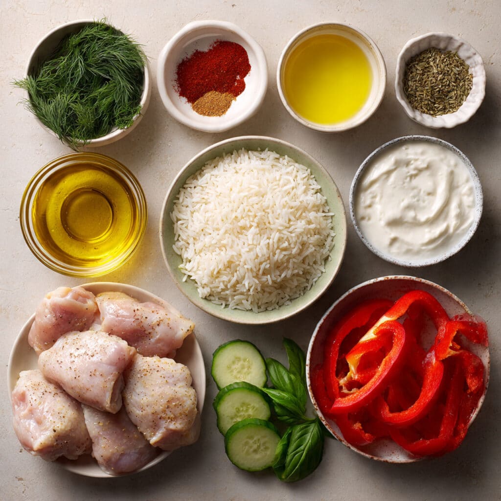 Ingredients in Juicy Pulled Chicken and Rice Bowl with Tzatziki