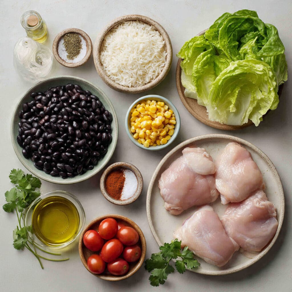 - Assemble bowls with rice, shredded chicken, beans, corn, tomatoes, lettuce, and cilantro.