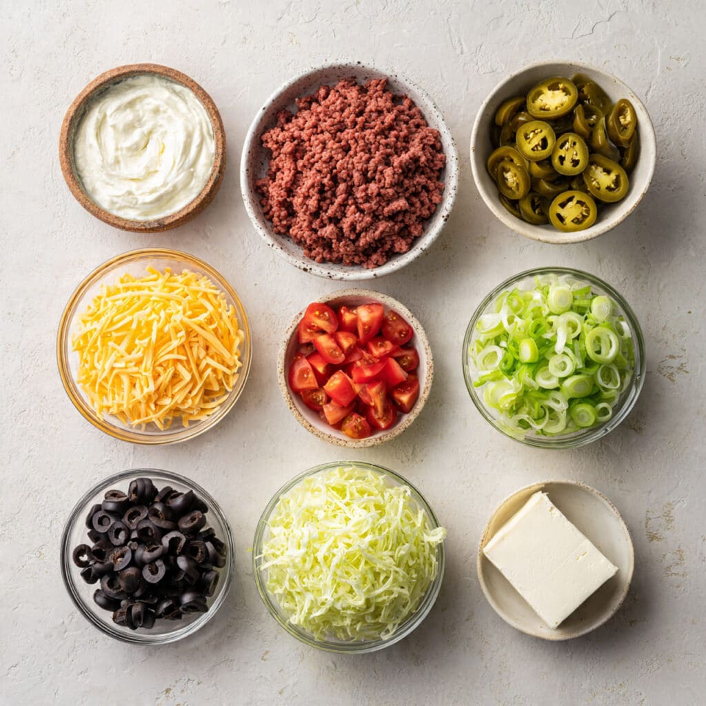 Taco bakes have long been a popular comfort food in American kitchens, often inspired by Tex-Mex flavors. What makes this one unique is its low carb twist no tortillas or carb-heavy fillers. Instead, it leans on protein, cheese, and fresh toppings to capture all that taco goodness in a more keto-friendly format.