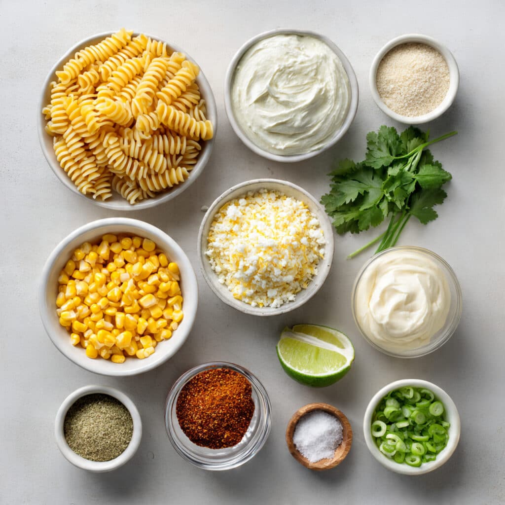 - Rotini pasta: 8 oz, cooked al dente. Its twists catch all the creamy dressing and bits of corn.