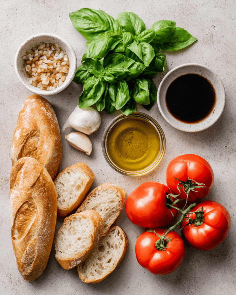 Mini bruschetta bites require just a few fresh ingredients that come together perfectly. Here’s a list of everything you’ll need: