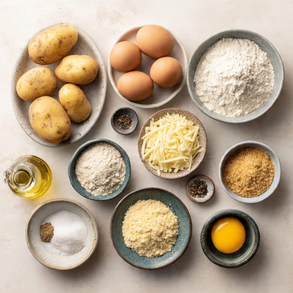 - Combine Ingredients: In a bowl, mix mashed potatoes, chopped eggs, cheese, flour, cornstarch, and spices until well combined