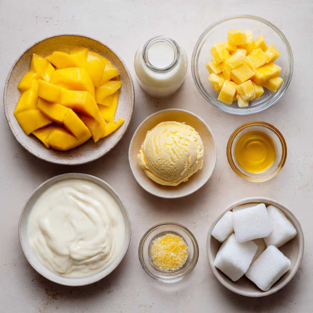 - Combine Ingredients: Add chopped mangoes, milk, lemon juice, lemon zest, ice cream, sweetener, and ice cubes to the blender. Blend until smooth and creamy.