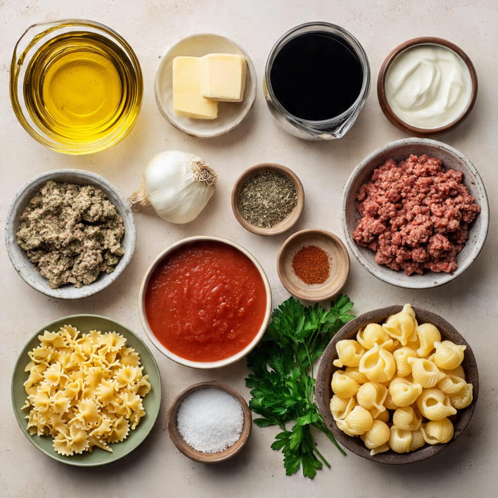 While this exact version leans into modern comfort food, it takes inspiration from a few familiar places. Creamy beef pasta skillets have become a weeknight staple in many American kitchens because they borrow the soul of Italian American red sauce pasta and combine it with the convenience of one pot cooking.