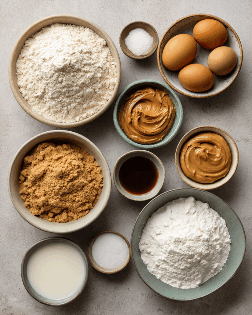 - Combine Ingredients: In a medium bowl, whisk together the flour, baking powder, and salt. In another bowl, mix the peanut butter, sugar, eggs, milk, and vanilla extract until smooth.