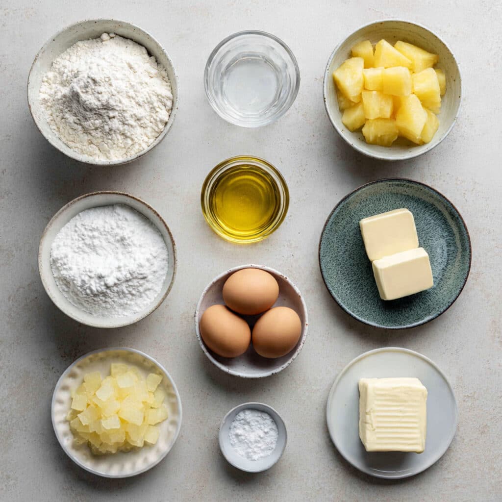 - Combine Ingredients: Mix flour, sugar, and baking powder in one bowl, then combine eggs, oil, pineapple, and vanilla in another.