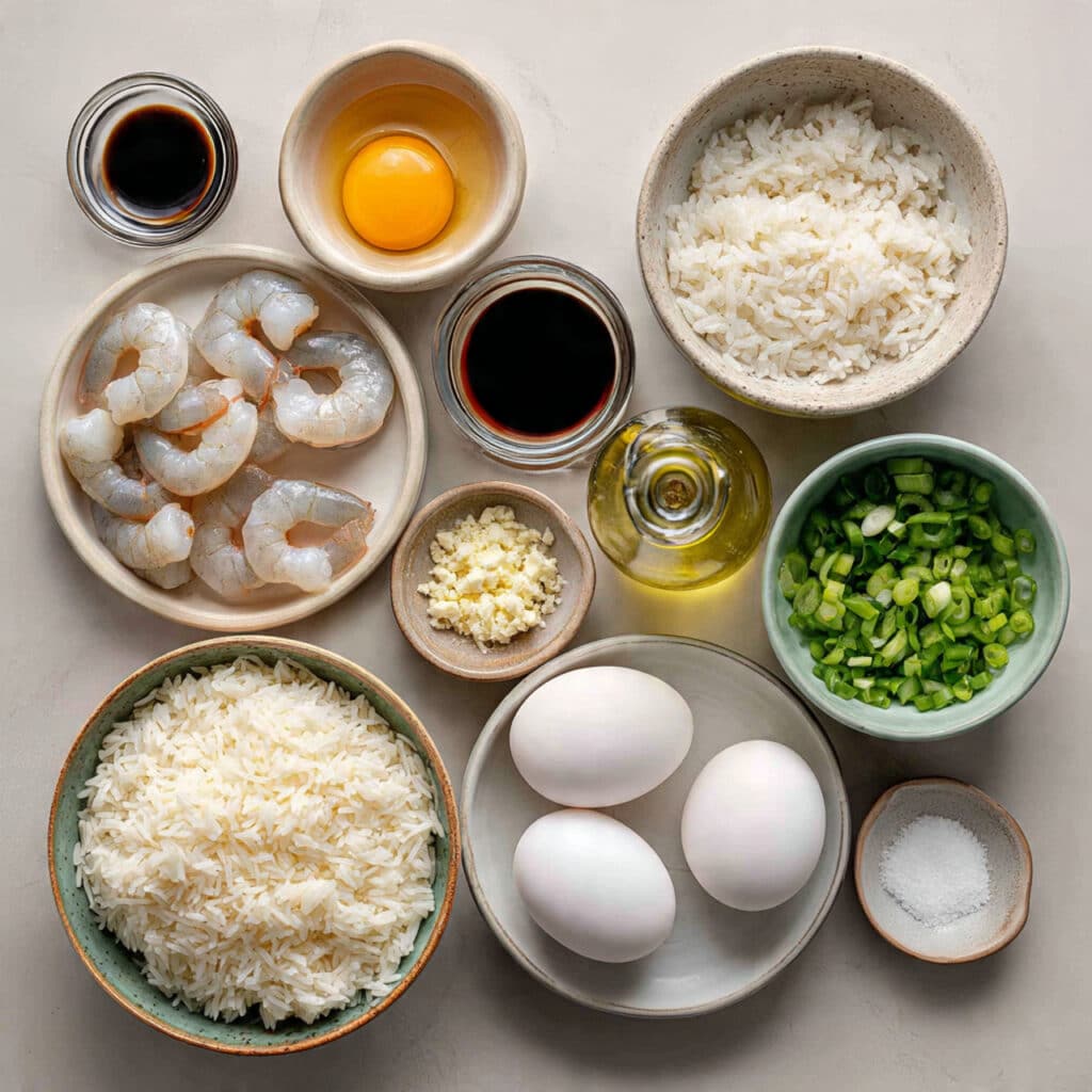 Fluffy jasmine rice stir-fried with tender prawns and soft, chiffon-style eggs, seasoned with garlic, soy, and oyster sauce for a quick, savory meal.