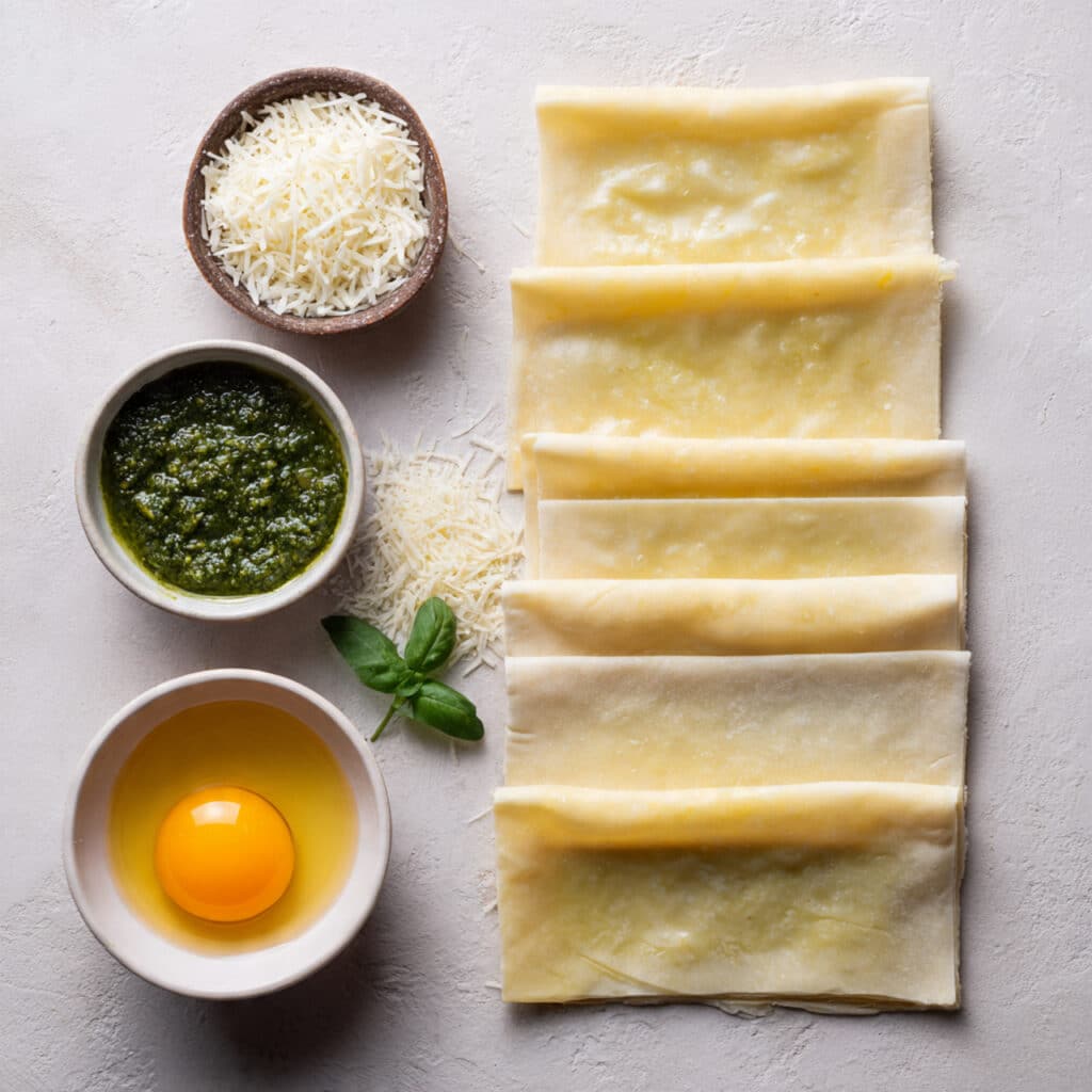Basil Pesto: Traditionally made with fresh basil, garlic, pine nuts, Parmesan, and olive oil, pesto brings a bold and aromatic punch that contrasts beautifully with the pastry.