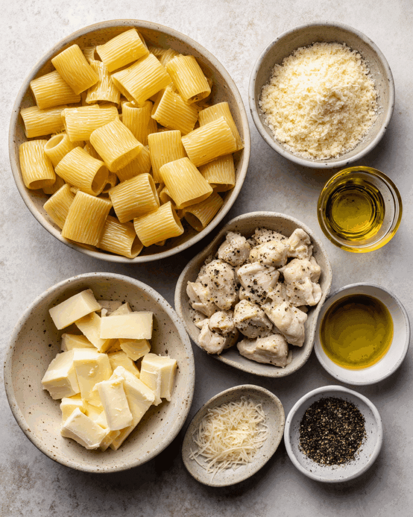 - Rigatoni pasta: 12 ounces. The large, ridged pasta holds the creamy sauce well and provides a satisfying bite.