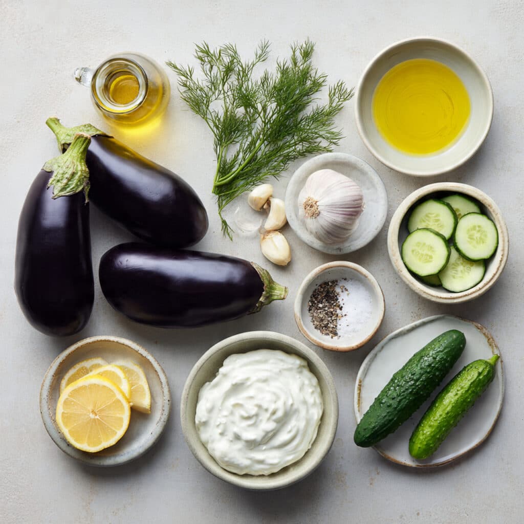 - Finishing Touches: While the eggplant roasts, mix Greek yogurt, grated cucumber, garlic, lemon juice, salt, and dill in a bowl. Chill briefly.
