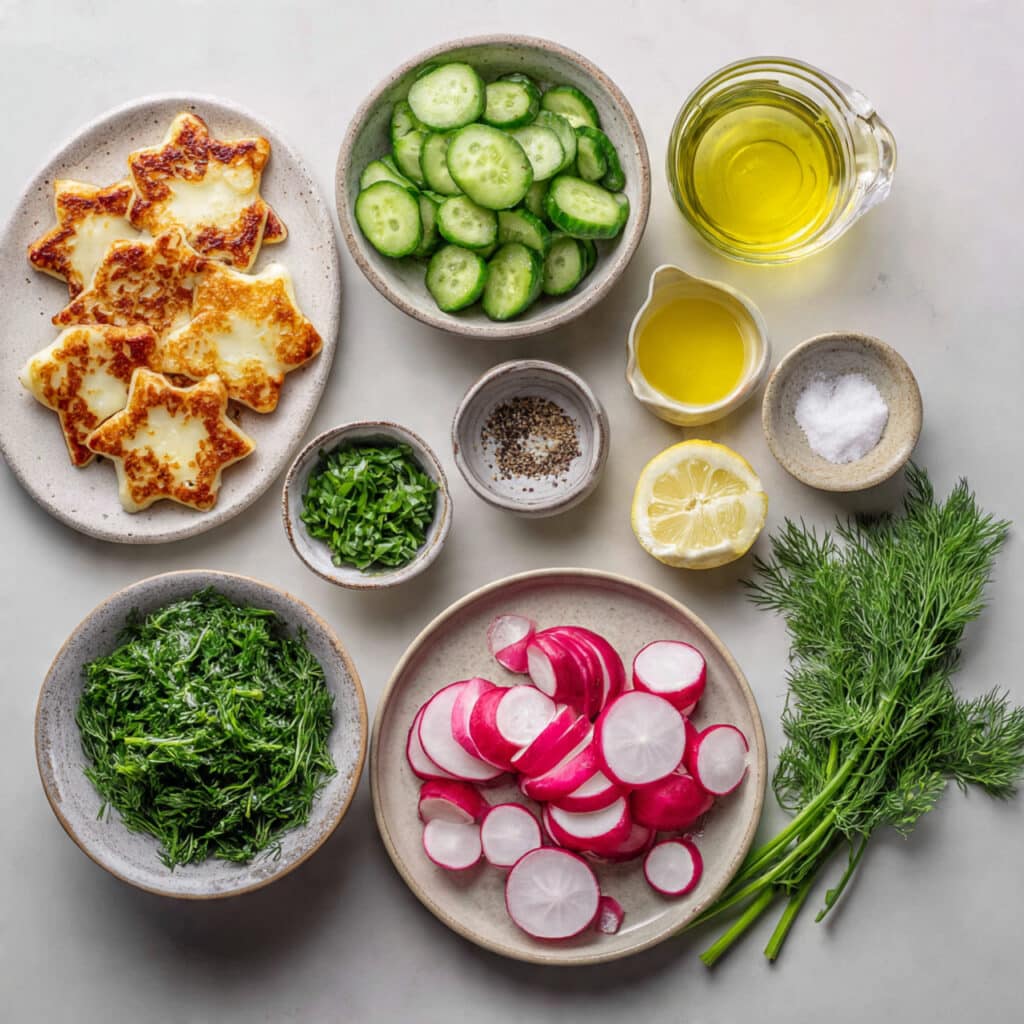 This salad came to life on a late afternoon when the kitchen was warm with golden light, and I had just picked up some fresh dill, cucumbers, and radishes from the local market. I had a block of halloumi waiting in the fridge, and a moment of whimsy inspired me to cut it into little stars before pan-frying them to golden perfection. The result was not only delicious but also visually delightful perfect for bringing a little magic to an everyday meal.