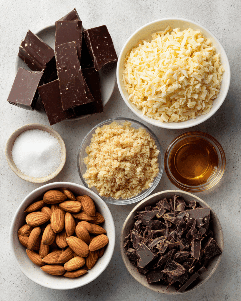 Almonds: Almonds bring both texture and flavor to this recipe. They are slightly sweet and nutty, adding crunch that contrasts beautifully with the smooth nougat and dark chocolate. Whether raw, roasted, or slivered, almonds elevate this treat to the next level.