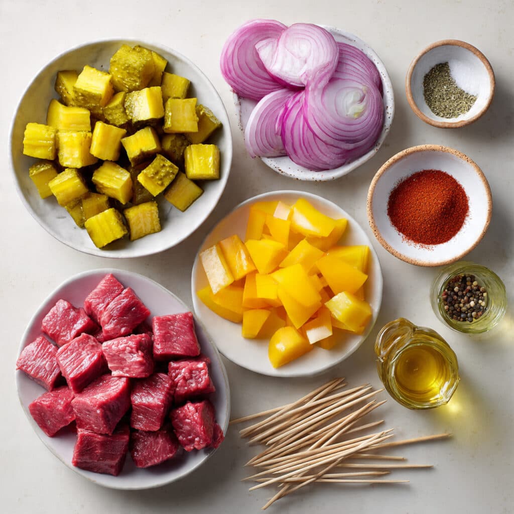 What makes these skewers stand out? It’s all about the contrast. The seared, juicy steak plays beautifully against the crispy, vinegary pickles. Bell peppers add a soft sweetness, while red onion brings in a mellow sharpness. Every bite is a layered experience of smoky, savory, and bright.