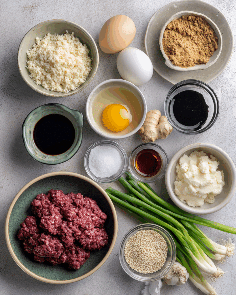 - Combine Ingredients: In a large bowl, mix the ground beef, breadcrumbs, milk, egg, garlic, ginger, salt, pepper, and soy sauce until just combined.