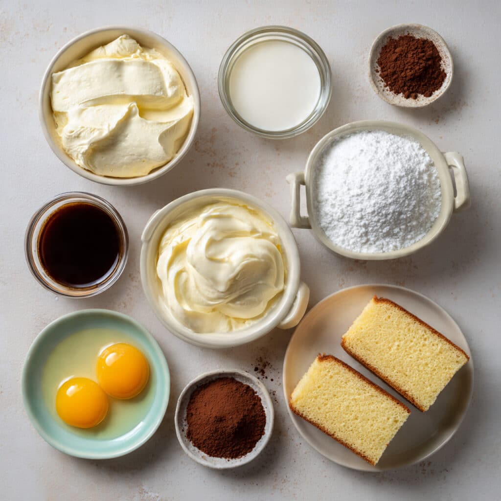 - Ladyfinger Sponge Cake or Sponge Layers: enough for 3 layers – soaks up the espresso and forms the cake’s base.
