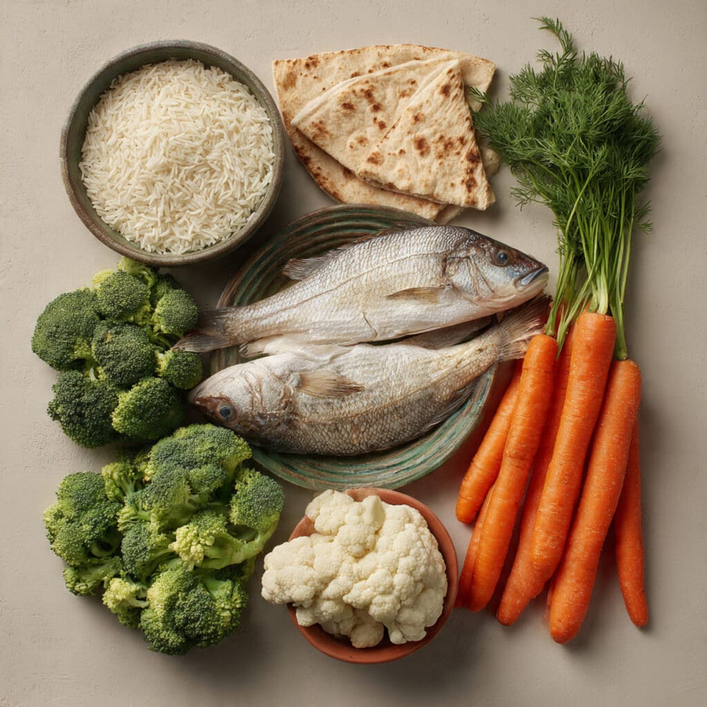 - Assemble the Dish: Arrange a portion of rice in the center of the plate. Add a serving of grilled fish, then surround it with the steamed vegetables. Place a piece of pita bread on the side.