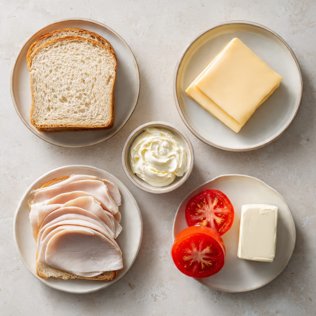 - Assemble the Dish: Layer turkey, cheese, and tomato between two slices of bread, buttered sides facing out.