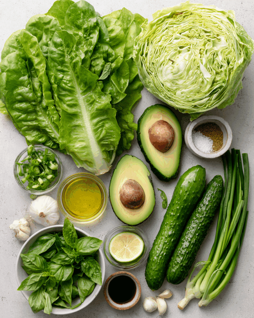 - Combine Ingredients: Toss the chopped romaine, shredded cabbage, diced cucumber, sliced green onions, and avocado in a large bowl.